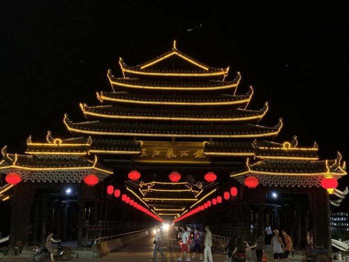 它将侗族的木构风雨桥与现代钢筋水泥结构相结合,聚集三江文化传统智慧,是长度和规模在国内乃至世界上都名列第一的特色风雨桥。风雨桥结构复杂而精致,只有模型,没有图纸,完全是玩“积木”般架起来的。曾有一位对风雨桥情有独钟的英国建筑师在三江跟班学习10年,带着模型回去还是无法“架”起风雨桥!